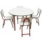 1 mesa confeccionada em metalão 20 x 30, chapa de 1,20 e pés em tubo 1 ¼, chapa de 1,20, com tratamento antiferruginoso e pintura eletrostática a pó epóxi em forno de alta temperatura. Tampo redondo em MDF 18mm, medindo 1,10mt de diâmetro altura de 77cm e bordas envernizadas. 4 Cadeiras confeccionada em tubo 7/8 feito na chapa de 1,20, assento medindo 38cm largura x 34cm comprimento, encosto anatômicos medindo 38cm de largura x 19cm de comprimento, revestidos em fórmica. Altura do encosto 75 cm x altura do assento 43 cm.
